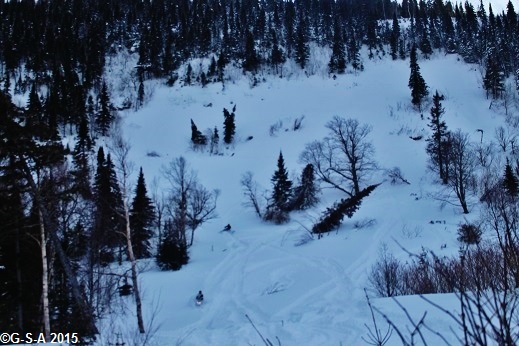 GT doings turns in deep powderHowever, one unfortunate rider experienced a complete track failure - yes, the track split and was no longer connected to the sled. The group quickly bound together, setup a convoy of sleds, and towed the failed sled back to the access road where it could be picked up.